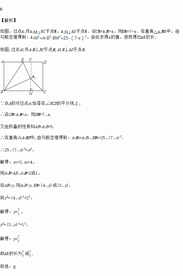 如图,在矩形ABCD中,AB=5,BC=7,点E是AD上一个动点,把△BAE沿BE向矩形内部折叠,当点A的对应点A1恰好落在∠BCD的平分线上时,则AE的长为( )