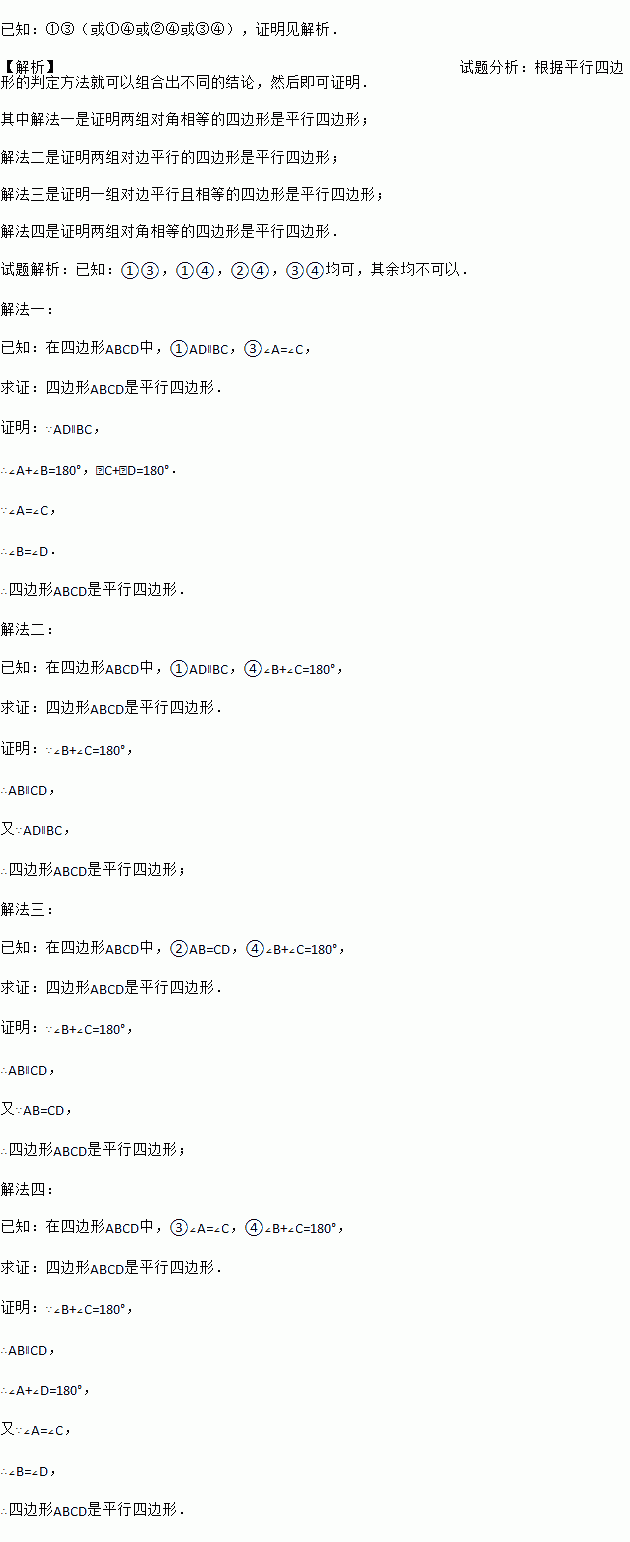 关系:①AD∥BC,②AB=CD,③∠A=∠C,④∠B+∠C=180°.