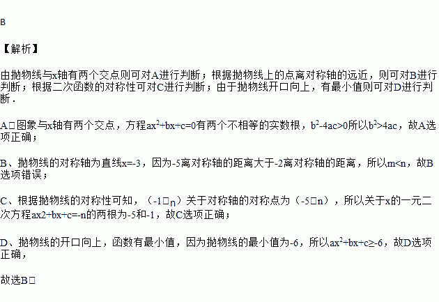 A. b2>4ac B. m>n C. 方程ax2+bx+c=﹣4的两根为﹣5或﹣1 D. ax2+bx+c≥﹣6