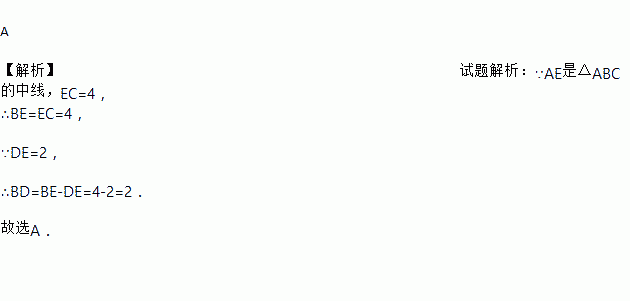 如图,AE是△ABC的中线,已知EC=4,DE=2,则BD的长为( )