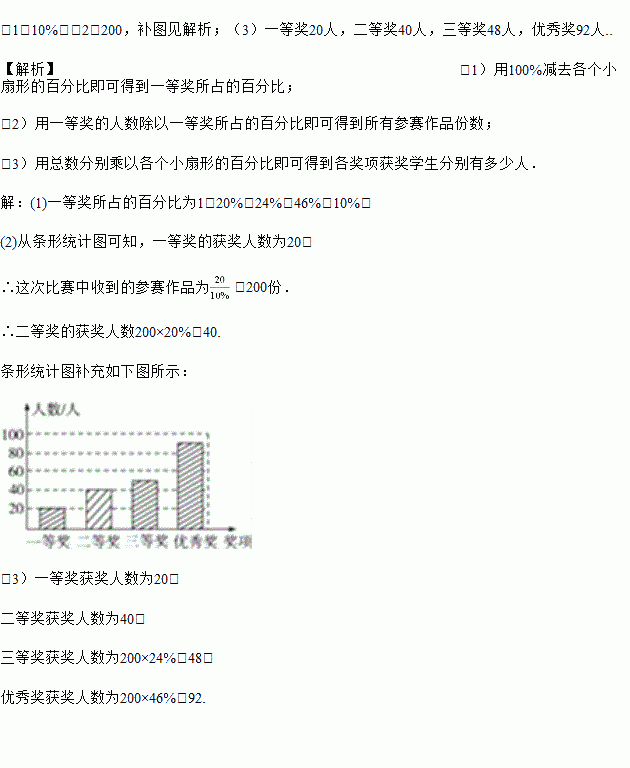 (2)在此次比赛中,一共收到多少份参赛作品?请将条形统计图补充完整.