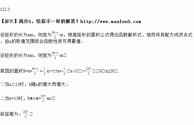 用一段长为30m的篱笆围成一个一边靠墙的矩形菜园,墙长20m,当矩形的长、宽各取某个特定的值时,菜园的面积最大,这个最大面积是_____m2.