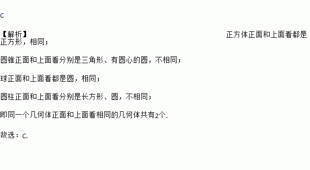 C 【解析】正方体正面和上面看都是正方形,相同; 圆锥正面和上面看分别是三角形、有圆心的圆,不相同; 球正面和上面看都是圆,相同; 圆柱正面和上面看分别是长方形、圆,不相同; 即同一个几何体正面和上面看相同的几何体共有2个. 故选:C.