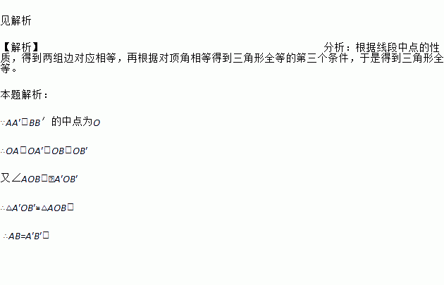 如图所示,小王想测量小口瓶下半部的内径,他把两根长度相等的钢条AA′,BB′的中点连在一起,A,B两点可活动,使M,N卡在瓶口的内壁上,A′,B′卡在小口瓶下半部的瓶壁上,然后量出AB的长度,就可量出小口瓶下半部的内径,请说明理由.