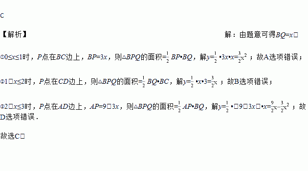 如图,正方形ABCD的边长为3cm,动点P从B点出发以3cm/s的速度沿着边BC﹣CD﹣DA运动,到达A点停止运动;另一动点Q同时从B点出发,以1cm/s的速度沿着边BA向A点运动,到达A点停止运动.设P点运动时间为x(s),△BPQ的面积为y(cm2),则y关于x的函数图象是( )