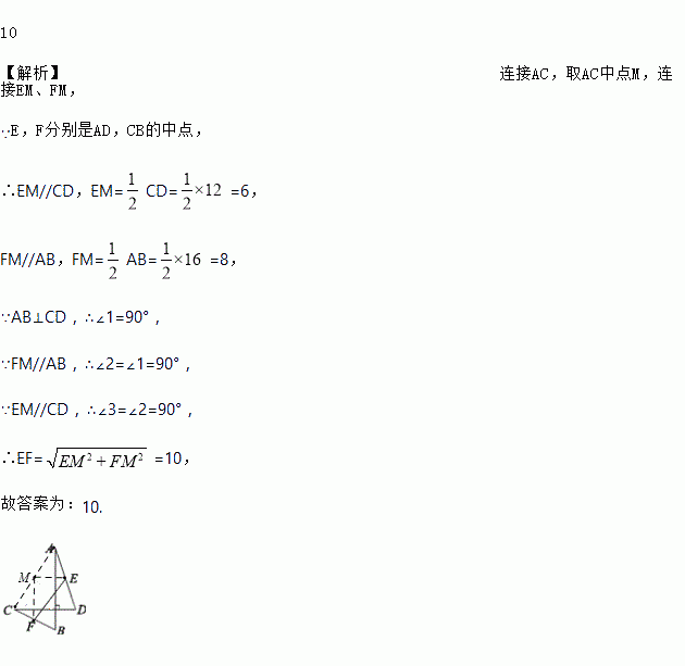 如图,已知线段AB⊥CD,E,F分别是AD,CB的中点,且AB=16,CD=12,则EF的长是________.
