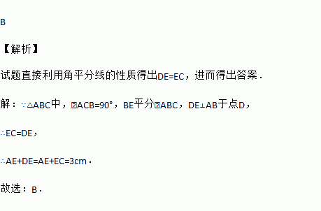 如图,在△ABC中,∠ACB=90°,BE平分∠ABC,DE⊥AB于D,如果AC=3cm,那么AE+DE等于( )