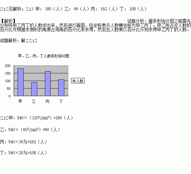 (2)如果整个圆代表540人,另求出甲、乙、丙、丁所代表的人数。