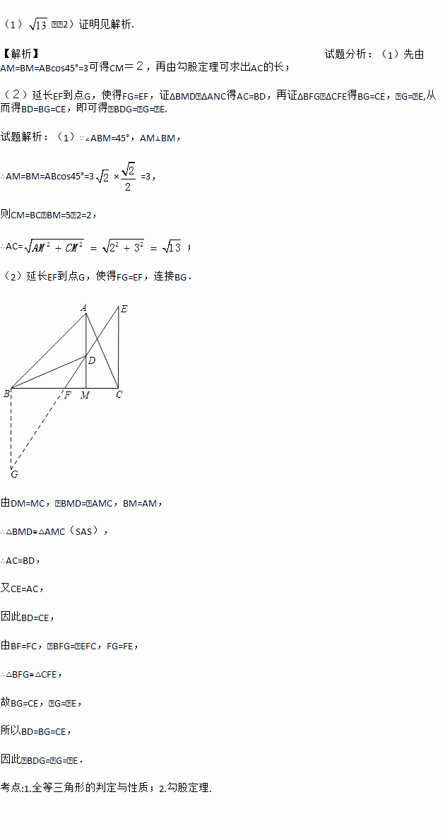 (2)如图②,点D是线段AM上一点,MD=MC,点E是△ABC外一点,EC=AC,连接ED并延长交BC于点F,且点F是线段BC的中点,求证:∠BDF=∠CEF.