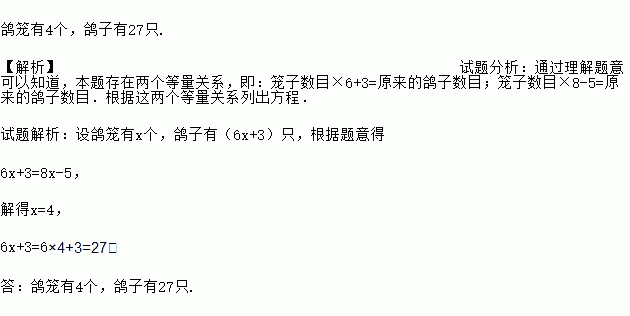 鸽笼有4个,鸽子有27只. 【解析】试题分析:通过理解题意可以知道,本题存在两个等量关系,即:笼子数目×6+3=原来的鸽子数目;笼子数目×8-5=原来的鸽子数目.根据这两个等量关系列出方程. 试题解析:设鸽笼有x个,鸽子有(6x+3)只,根据题意得 6x+3=8x-5, 解得x=4, 6x+3=6×4+3=27, 答:鸽笼有4个,鸽子有27只.