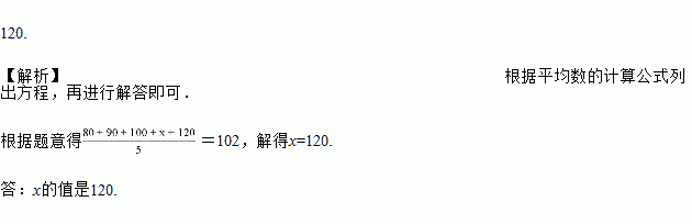 某中学八(1)班5名学生某次数学测验的成绩分别为80分,90分,100分,x分,120分,若这5名学生的平均成绩为102分,求x的值.