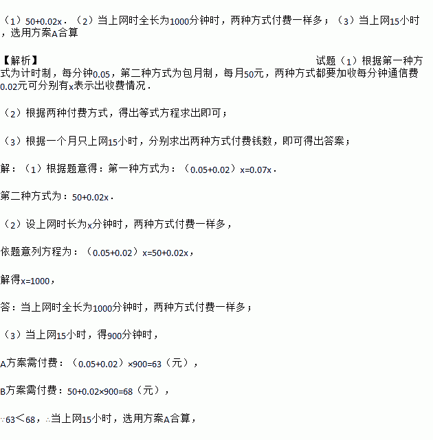 加油啊!小朋友!春节快到了,移动公司为了方便学生上网查资料,提供了两种上网优惠方法:A.计时制:0.05元/分钟,B.包月制:50元/月(只限一台电脑上网),另外,不管哪种收费方式,上网时都得加收通讯费0.02元/分.