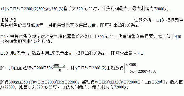 我国中东部地区雾霾天气趋于严重,环境治理已刻不容缓.我市某电器商场根据民众健康需要,代理销售某种家用空气净化器,其进价是200元/台.经过市场销售后发现:在一个月内,当售价是400元/台时,可售出200台,且售价每降低10元,就可多售出50台.若供货商规定这种空气净化器售价不能低于300元/台,代理销售商每月要完成不低于450台的销售任务.
