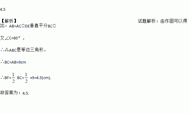 如图,分别以线段BC的两个端点为圆心、适当长度(大于BC长的一半)为半径作圆弧,两弧相交于点D和E;作直线DE交BC于点F;在直线DE上任取一点A(点A不与点F重合),连结AB、AC.若AB=9cm,∠C=60