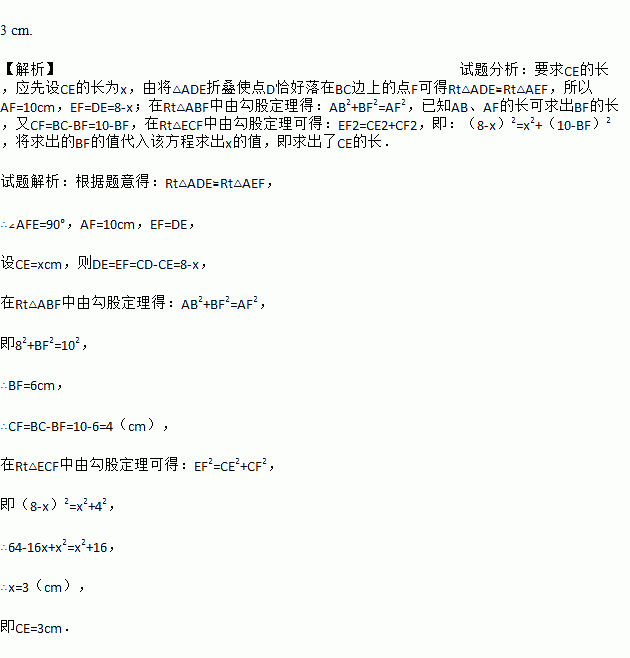 (10分)已知,如图,折叠长方形(四个角都是直角,对边相等)的一边AD使点D落在BC边的点F处,已知AB=8 cm,BC=10 cm,求EC的长.