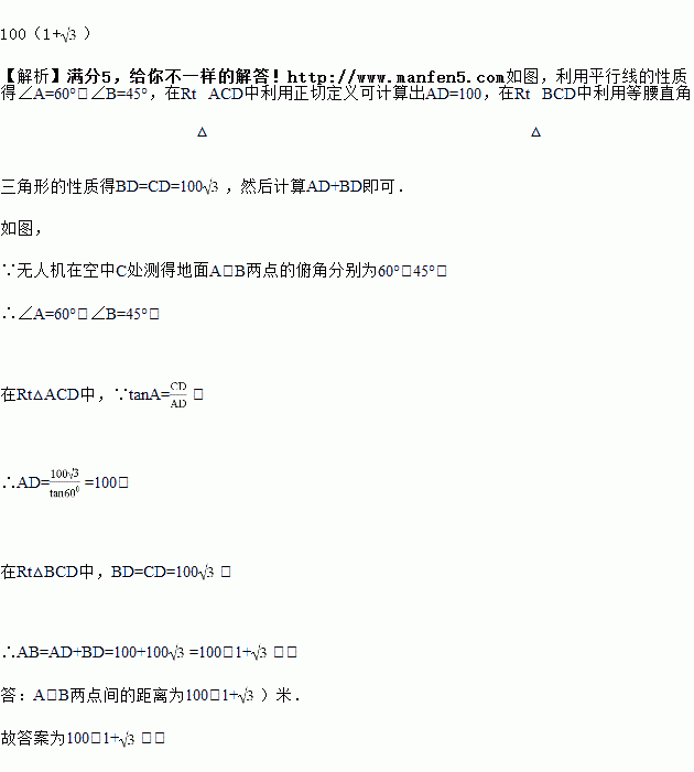 如图,无人机在空中C处测得地面A、B两点的俯角分别为60°、45°,如果无人机距地面高度CD为米,点A、D、E在同一水平直线上,则A、B两点间的距离是_____米.(结果保留根号)