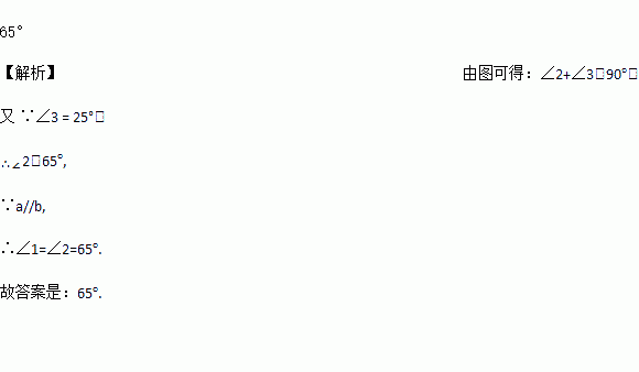 如图,直角三角尺的直角顶点在直线b上,∠3 = 25°,转动直线a,当∠1= _________,时,a∥b