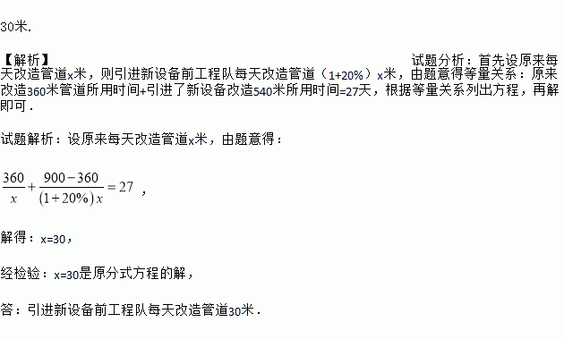 为缓解扬州城区交通压力,城市南部快速通道已于4.18开工建设.某工程队承担了某道路900米长的改造任务.工程队在改造完360米道路后,引进了新设备,每天的工作效率比原来提高了20%,结果共用27天完成了任务,问引进新设备前工程队每天改造道路多少米?