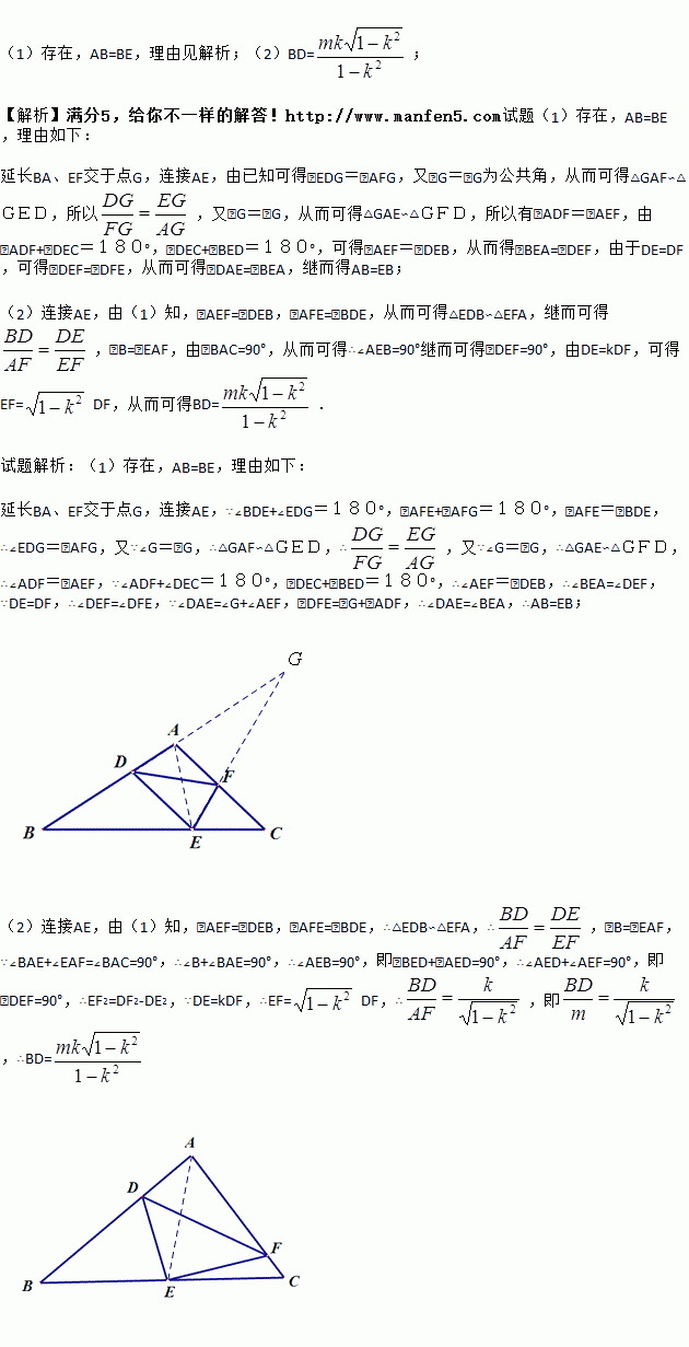 (2)如图2,当DE=kDF(其中0<k<1)时,若∠A=90°,AF=m,求BD的长(用含k,m的式子表示).
