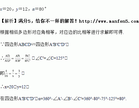 在如图所示的两个相似的四边形中,求x,y,∠α的值.