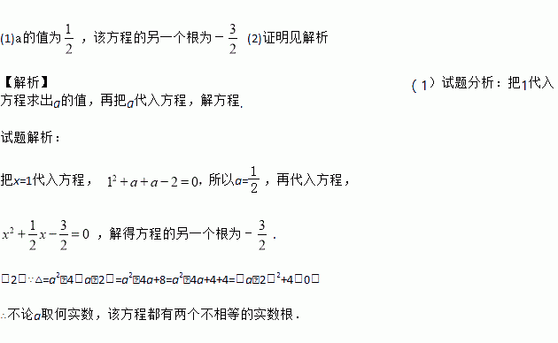 (1)a的值为,该方程的另一个根为- (2)证明见解析 【解析】(1)试题分析:把1代入方程求出a的值,再把a代入方程,解方程. 试题解析: 把x=1代入方程, 所以a=,再代入方程, ,解得方程的另一个根为﹣. (2)∵△=a2﹣4(a﹣2)=a2﹣4a+8=a2﹣4a+4+4=(a﹣2)2+4>0, ∴不论a取何实数,该方程都有两个不相等的实数根.