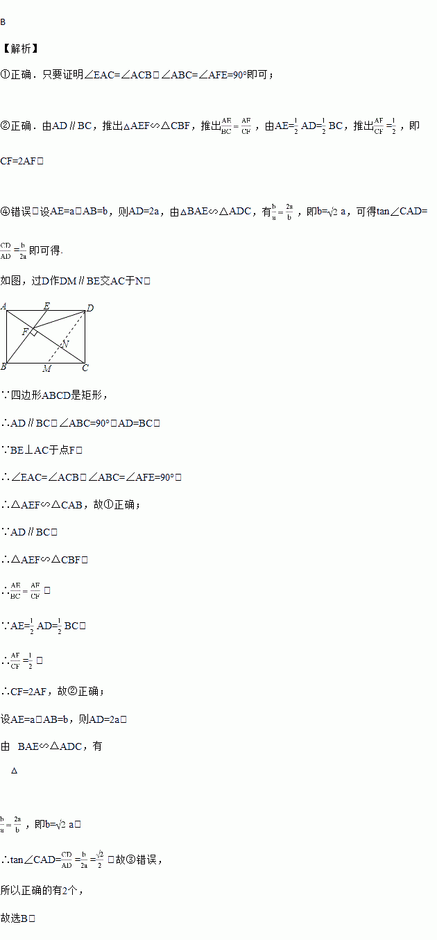 如图,在矩形ABCD中,E是AD边的中点,BE⊥AC,垂足为点F,连接DF,下列结论:①△AEF∽△CAB;②CF=2AF;③tan∠CAD=