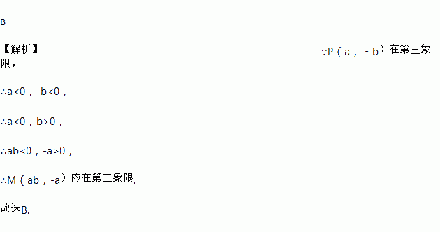B 【解析】∵P(a,﹣b)在第三象限, ∴a<0,-b<0, ∴a<0,b>0, ∴ab<0,-a>0, ∴M(ab,-a)应在第二象限. 故选B.