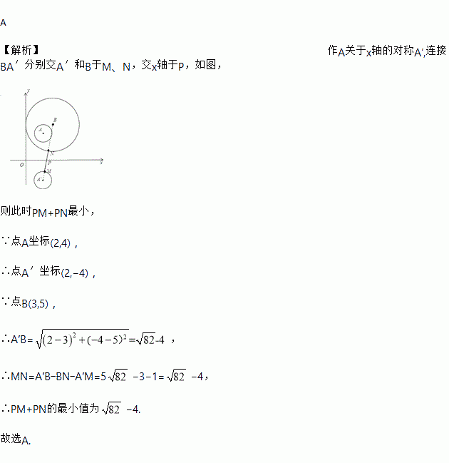 在平面直角坐标系中,以点A(2,4)为圆心,1为半径作⊙A,以点B(3,5)为圆心,3为半径作⊙B,M、N分别是⊙A,⊙B上的动点,P为x轴上的动点,则PM+PN的最小值为( )