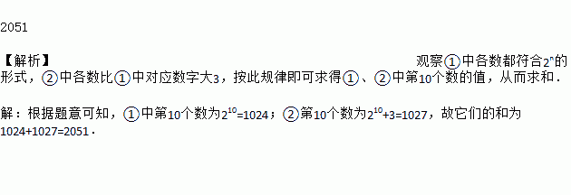 2051 【解析】观察①中各数都符合2n的形式,②中各数比①中对应数字大3,按此规律即可求得①、②中第10个数的值,从而求和. 【解析】 根据题意可知,①中第10个数为210=1024;②第10个数为210+3=1027,故它们的和为1024+1027=2051.
