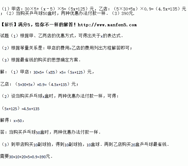 为更好的参与“阳光体育”大课间活动,某班将买一些乒乓球和乒乓球拍,现了解情况如下:甲、乙两家商店出售两种同样品牌的兵兵球和乒乓球拍.兵乓球拍毎副定价30元,兵兵球毎盒定价5元,两店促销活动如下:甲店毎买一副球拍赠一盒乒乓球,乙店两种商品均按定价的9折优惠.