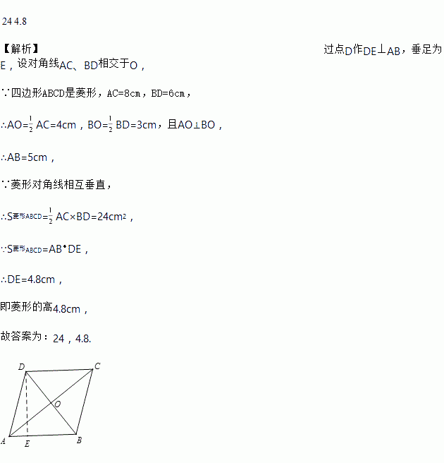 在菱形ABCD中,对角线AC、BD长分别为8cm、6cm,菱形的面积为_________cm2,菱形的高是_______cm.