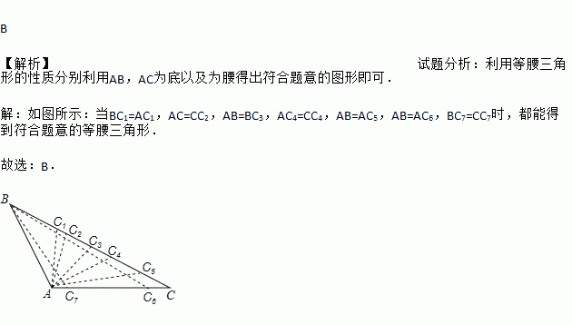 B 【解析】试题分析:利用等腰三角形的性质分别利用AB,AC为底以及为腰得出符合题意的图形即可. 【解析】 如图所示:当BC1=AC1,AC=CC2,AB=BC3,AC4=CC4,AB=AC5,AB=AC6,BC7=CC7时,都能得到符合题意的等腰三角形. 故选:B.