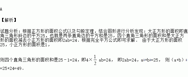 我国古代数学家赵爽的“勾股方圆图”是由四个全等的直角三角形与中间的一个小正方形拼成的一个大正方形(如图所示),如果大正方形的面积是25,小正方形的面积是1,直角三角形的两直角边分别是a和b,那么(a+b)2的值为( )