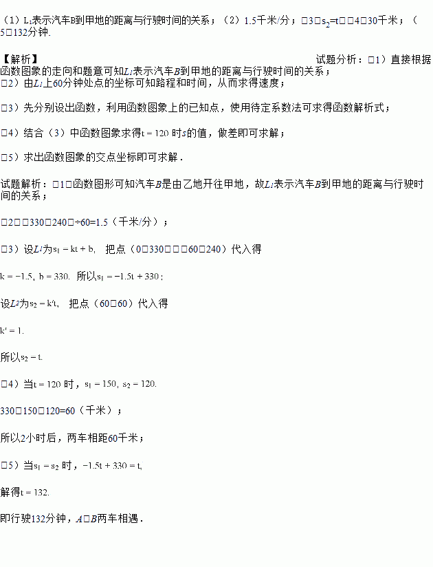 A、B两辆汽车同时从相距330千米的甲、乙两地相向而行,s(千米)表示汽车与甲地的距离,t(分)表示汽车行驶的时间,如图,L1,L2分别表示两辆汽车的s与t的关系.