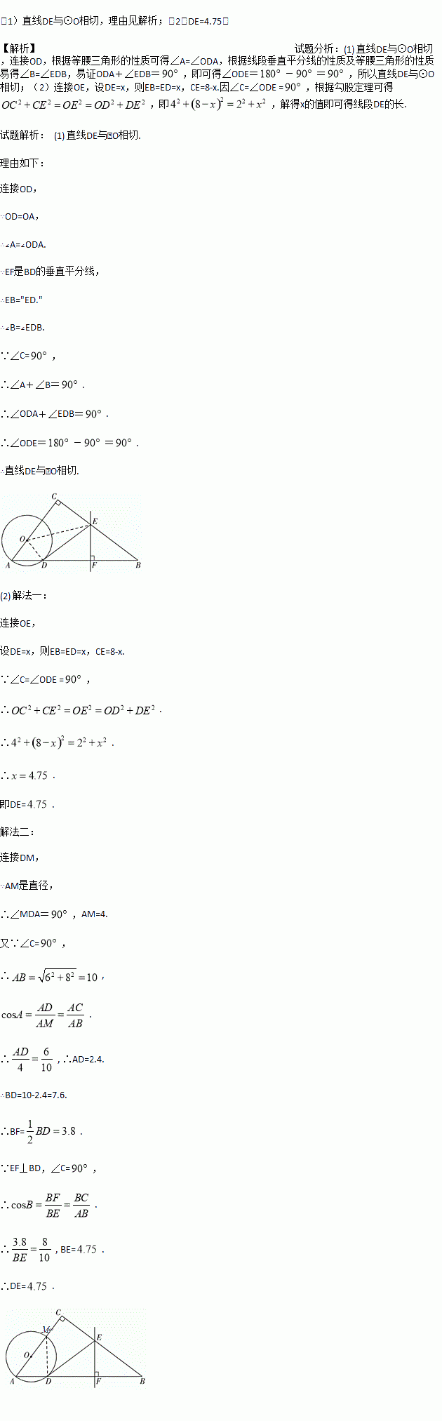 (2)若AC=6,BC=8,OA=2,求线段DE的长.