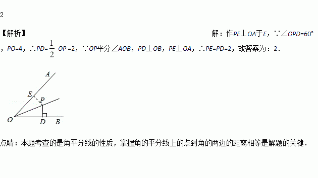 如图,OP平分∠AOB,PD⊥OB于D,∠OPD=60°,PO=4,则点P到边OA的距离是__.