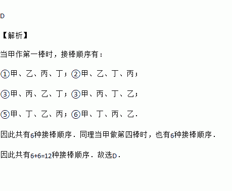 甲、乙、丙、丁四名运动员参加4×100米接力赛,甲必须为第一接力棒或第四接力棒的运动员,那么这四名运动员在比赛过程的接棒顺序有( )