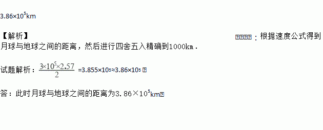 3.86×105km 【解析】试题分析:根据速度公式得到月球与地球之间的距离,然后进行四舍五入精确到1000km. 试题解析:=3.855×105≈3.86×105 . 答:此时月球与地球之间的距离为3.86×105km.