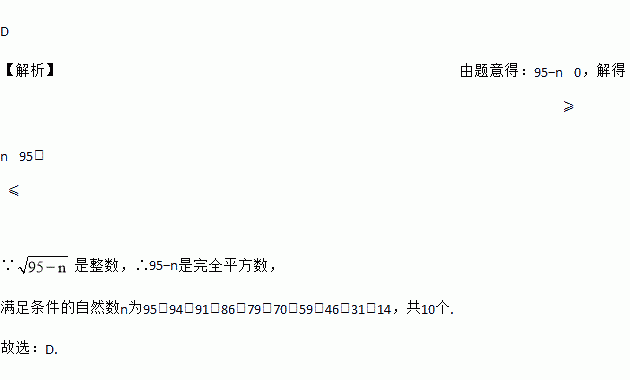 D 【解析】由题意得:95?n?0,解得n?95, ∵是整数,∴95?n是完全平方数, 满足条件的自然数n为95,94,91,86,79,70,59,46,31,14,共10个. 故选:D.