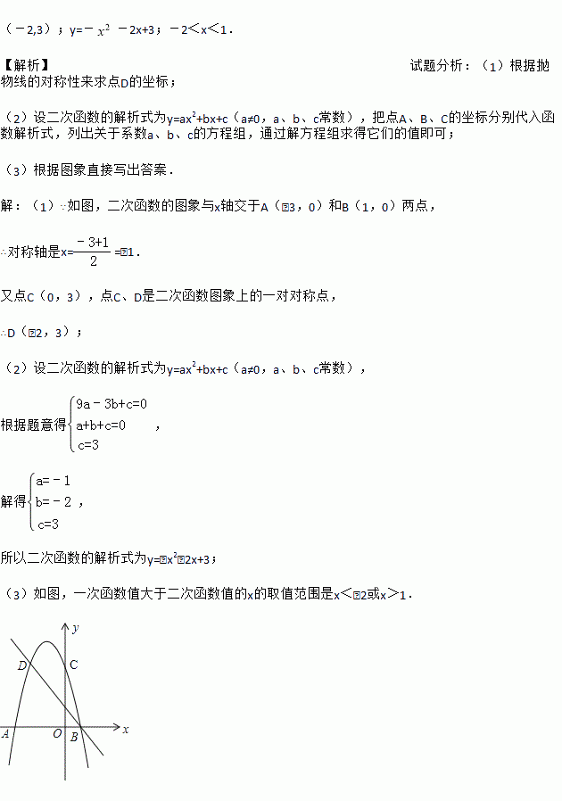 如图,二次函数的图象与x轴相交于A(﹣3,0)、B(1,0)两点,与y轴相交于点C(0,3),点C、D是二次函数图象上的一对对称点,一次函数的图象过点B、D.