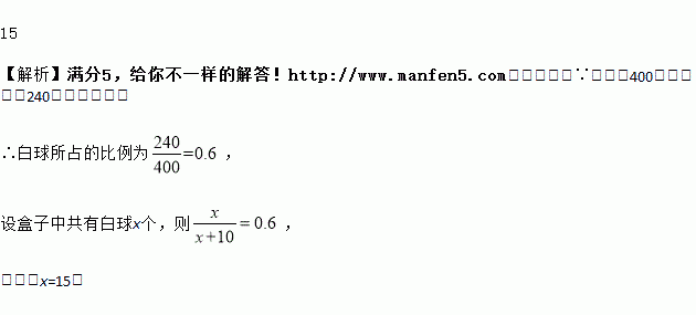 一个不透明的盒子中装有10个黑球和若干个白球,它们除颜色不同外,其余均相同,从盒子中随机摸出一球记下其颜色,再把它放回盒子中摇匀,重复上述过程,共试验400次,其中有240次摸到白球,由此估计盒子中的白球大约有________个.
