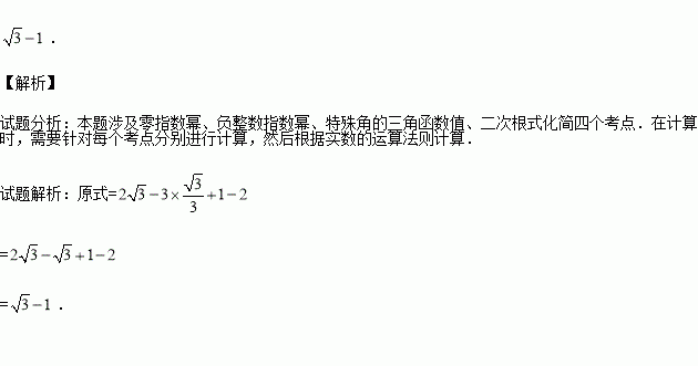 计算:-3tan30°+(π-4)0-()-1.