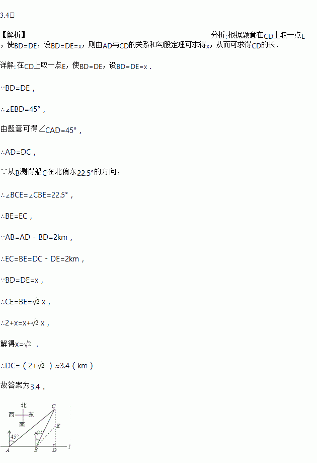 如图,在一笔直的海岸线l上有A、B两个观测站,AB=2km,从A测得船C在北偏东45°的方向,从B测得船C在北偏东22.5°的方向,则船C离海岸线l的距离(即CD的长)为_____km(精确到0.1).