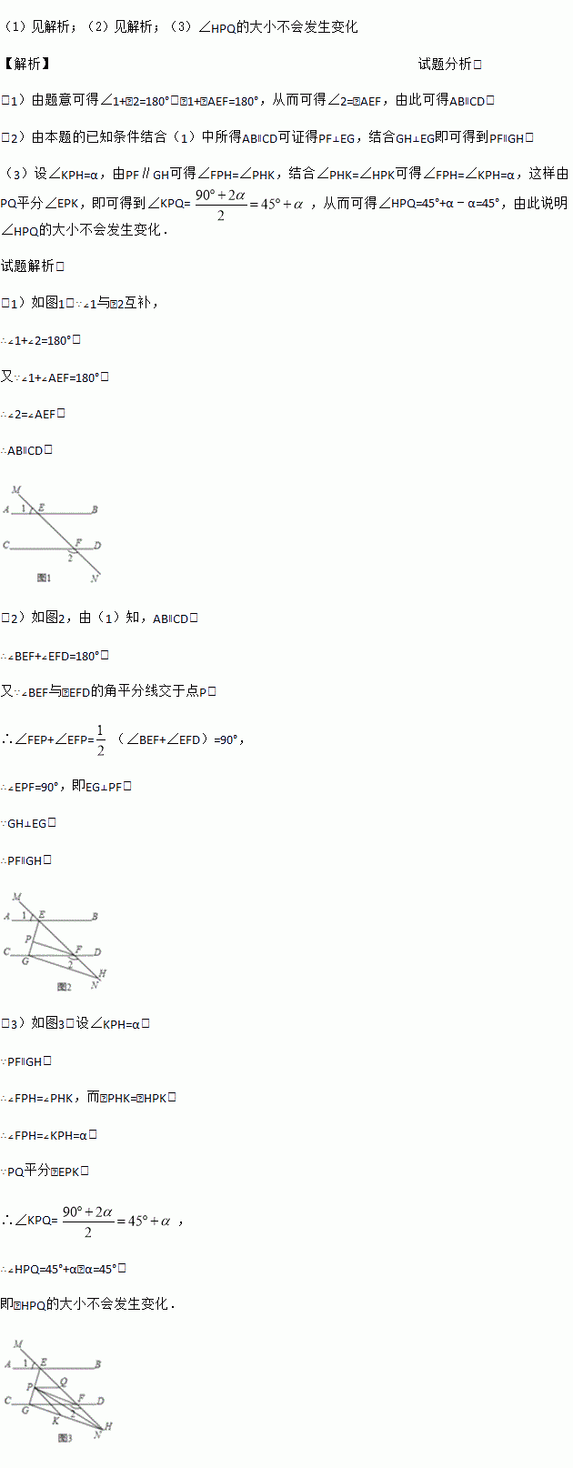 (3)如图3,在(2)的条件下,连接PH,K是GH上一点,且∠PHK=∠HPK,作∠EPK的平分线交直线MN于点Q.问∠HPQ的大小是否发生变化?若不变,请求出∠HPQ的度数;若变化,请说明理由.