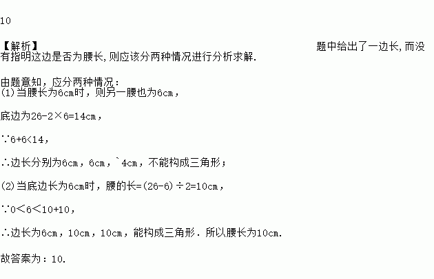 已知等腰三角形的周长为26cm,其中一条边的长为6cm,那么它的腰长为________cm.