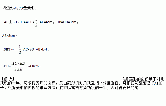 如图,四边形ABCD是菱形,对角线AC=8cm,BD=6cm,DH⊥AB于H,求DH的长。