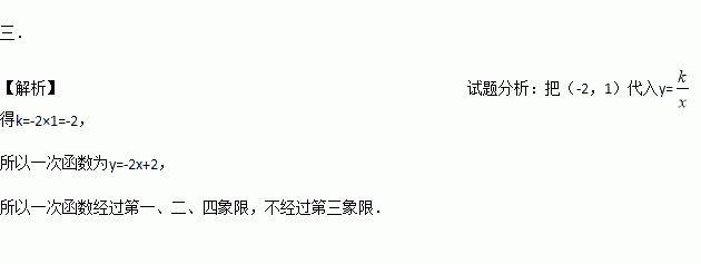 若反比例函数y=的图象过点(-2,1),则一次函数y=kx-k的图象不过第 象限.
