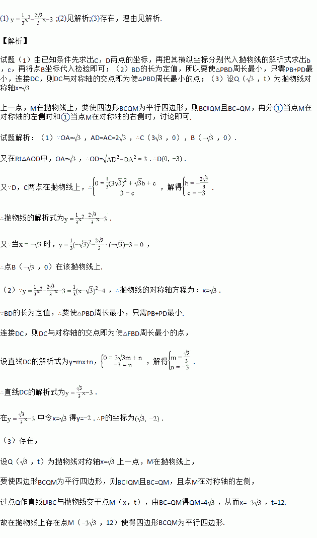 (3)设为(1)中的抛物线的对称轴上的一点,在抛物线上是否存在这样的点![]()