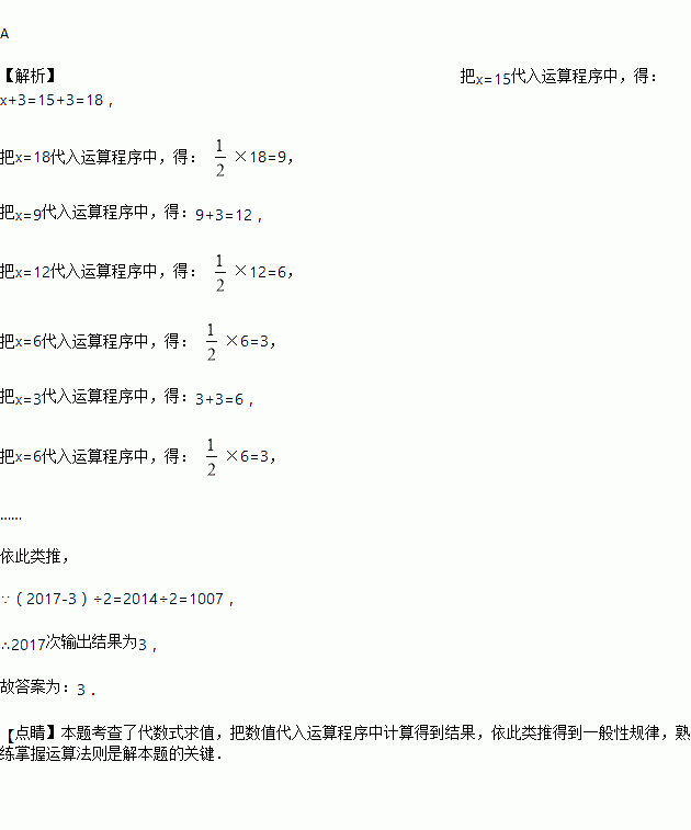 如图所示的运算程序中,若开始输入的x值为15,则第1次输出的结果为18,第2次输出的结果为9,…,第2017次输出的结果为( )