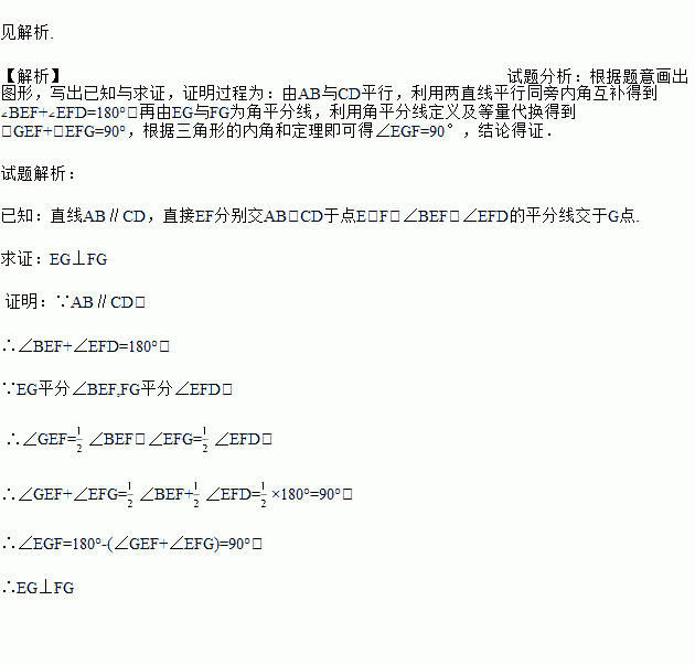 见解析. 【解析】试题分析:根据题意画出图形,写出已知与求证,证明过程为:由AB与CD平行,利用两直线平行同旁内角互补得到∠BEF+∠EFD=180°,再由EG与FG为角平分线,利用角平分线定义及等量代换得到∠GEF+∠EFG=90°,根据三角形的内角和定理即可得∠EGF=90°,结论得证. 试题解析: 已知:直线AB∥CD,直接EF分别交AB,CD于点E,F,∠BEF,∠EFD...
